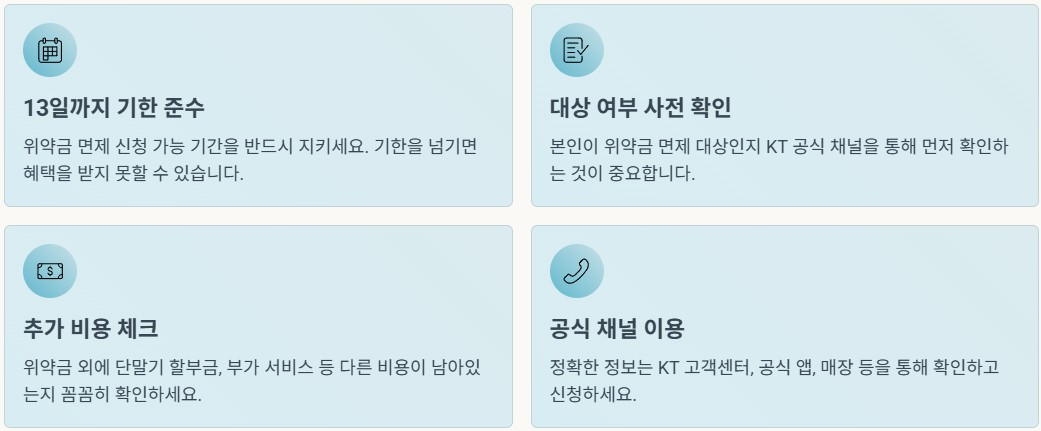 아래에서는 위약금 면제 신청 흐름과 확인해야 할 체크 포인트를 한 번에 정리해 두었으니, 해지나 번호 이동을 고민 중이라면 꼭 참고해 보시길 바랍니다. 자세한 적용 기준은 KT 공식 안내를 기준으로 최종 확인하시는 것이 가장 안전합니다.